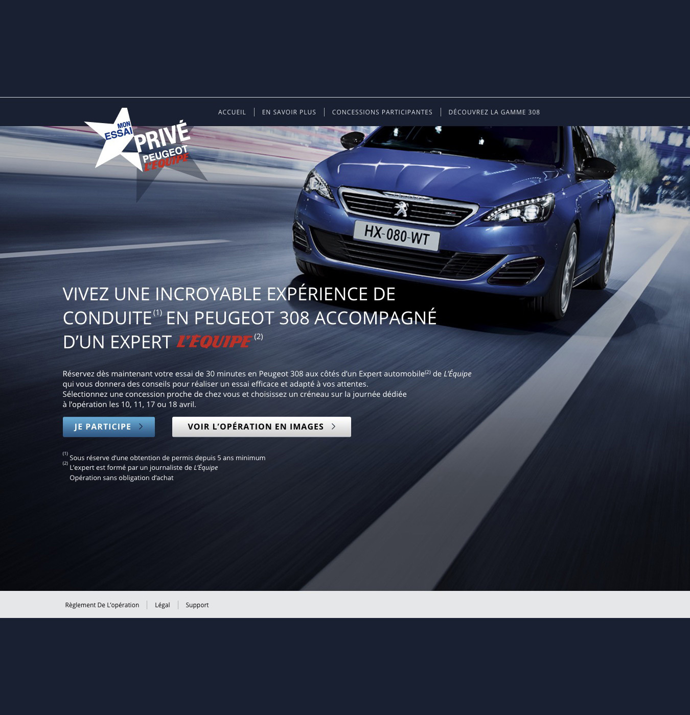 PSA France wanted the general public to actively participate in testing the new Peugeot 308 accompanied by a sports journalist from the newspaper l'Equipe. It was necessary to motivate candidates and Peugeot dealers throughout France to take part in these exclusive tests. By having them fill out a questionnaire relating to their trial but also having them write and publish the full report of their experience in the sports newspaper L'Equipe. Then select and win the authors of the best reports in more advanced tests on the circuit.